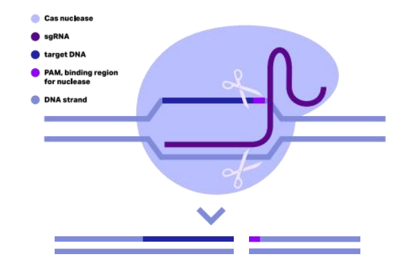 - 結(jié)合 PAM 序列后,雙鏈 DNA 解旋,sgRNA 可與其中一條 DNA 鏈退火;若 PAM 附近 DNA 序列與 sgRNA 的 crRNA 序列充分互補,Cas9 會切割 DNA 靶標,產(chǎn)生平端雙鏈斷裂。