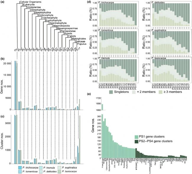 為了確定楊屬植物內(nèi)基因的進化起源,作者對6個高質(zhì)量測序的楊屬基因組進行了分析,6種楊屬基因組被分為17個系統(tǒng)發(fā)育層(PS1-PS17),PS1基因占比超51%,是基因組的主要成分;蚣易寰垲惙治鲲@示,PS1的基因家族發(fā)生了顯著擴張,表明這些古老基因的擴張可能塑造了楊樹進化的遺傳學(xué)基礎(chǔ)。