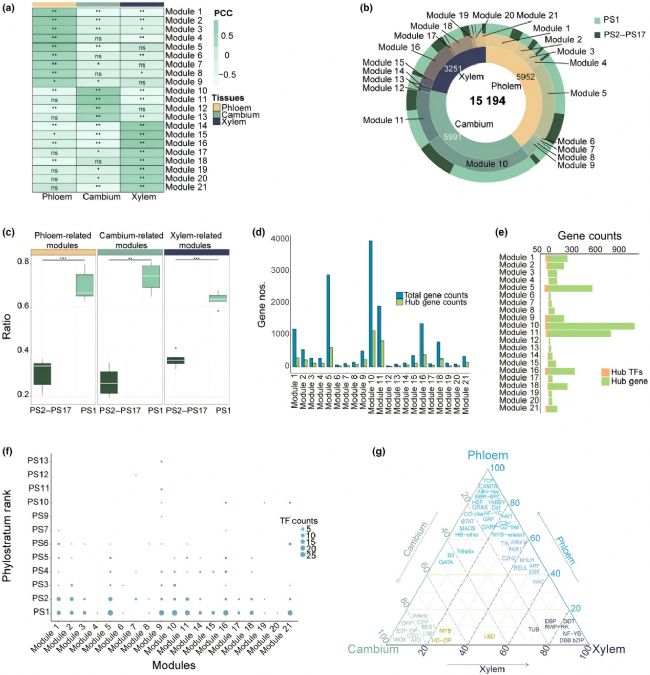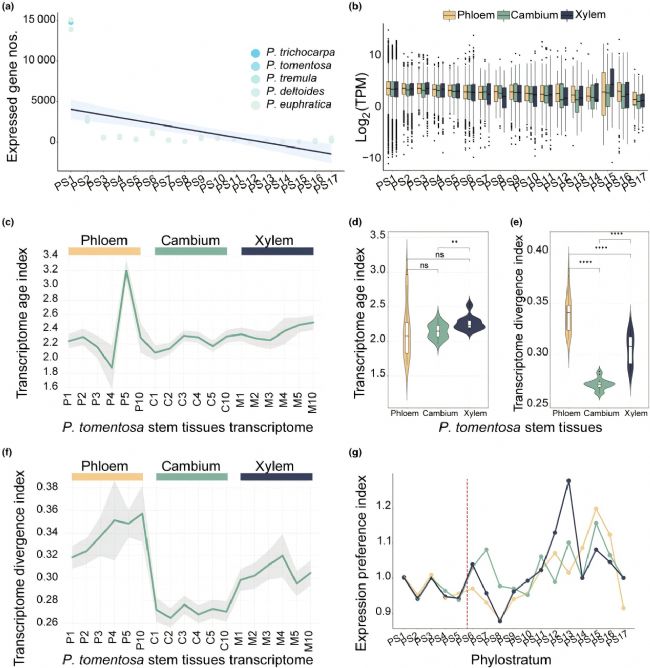 通過對5種楊樹維管組織(韌皮部/形成層/木質(zhì)部)進行轉(zhuǎn)錄組學(xué)分析,并計算TAI/TDI及表達偏好指數(shù)(EP),結(jié)果顯示PS1基因占表達基因的61.55%-66.38%,且在木質(zhì)部、形成層、韌皮部中均呈現(xiàn)相似的表達水平,但轉(zhuǎn)錄分化程度差異顯著,且存在組織特異性表達模式。表明PS1基因的特異性表達驅(qū)動了楊樹次生維管系統(tǒng)轉(zhuǎn)錄調(diào)控網(wǎng)絡(luò)的差異形成。