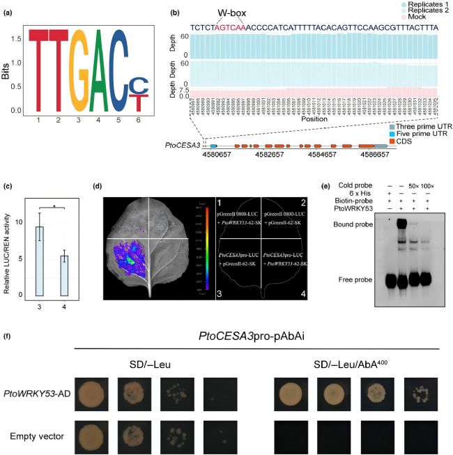 進一步通過DAP-seq探究PtoWRKY53 在木質(zhì)部發(fā)育中的直接靶標(biāo)。發(fā)現(xiàn)在下游靶基因的啟動子區(qū)域存在464個共同結(jié)合位點。順式作用元件W-box(TTGAC)始終位于每個峰的中心,且在兩個重復(fù)實驗中表現(xiàn)出很強的可重復(fù)性。差異表達分析結(jié)果表明,Potri.016G054900(PtrCESA3)、Potri.004G118700(PtrTPXL5)、Potri.002G254800和Potri.006G047300直接受其調(diào)控。已知CESA3在擬南芥中影響纖維素合成,在楊樹中可能發(fā)揮類似作用。這表明PtoWRKY5可能直接調(diào)控PtoCESA3的表達。后續(xù)通過雙熒光素酶報告實驗、EMSA和Y1H證實,PtoWRKY53通過結(jié)合PtoCESA3啟動子的W-box抑制其轉(zhuǎn)錄,減少了木質(zhì)部纖維細胞次生壁的沉積,最終負調(diào)控楊樹木質(zhì)部發(fā)育。