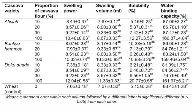 研究者對(duì)這些木薯粉和小麥粉的水分含量和水分活度、pH值和可滴定酸度、面粉的淀粉和直鏈淀粉含量、色澤、膨脹力、溶脹體積和溶解度指數(shù)、保水能力、糊化特性等逐一進(jìn)行了測(cè)定。