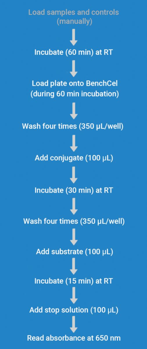 Figure 2. IDEXX AI MultiS-Screen Ab Test procedure. Steps performed by theAgilent BenchCel microplate handler, Agilent BioTek 406 FX washer dispenser, and Agilent BioTek Cytation 7 cell imaging multimode reader.