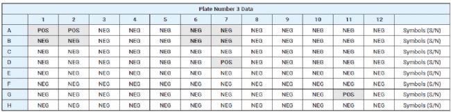 Table 4. Example of plate number 3 data output of cutoff (S/N) symbols using Agilent BioTek Gen5 microplate reader and imager software. Cutoff criteria are programmed in the Gen5 software, allowing automated data analysis and output of interpretation to be viewed as symbols for either negative (NEG) or positive (POS) assay results.