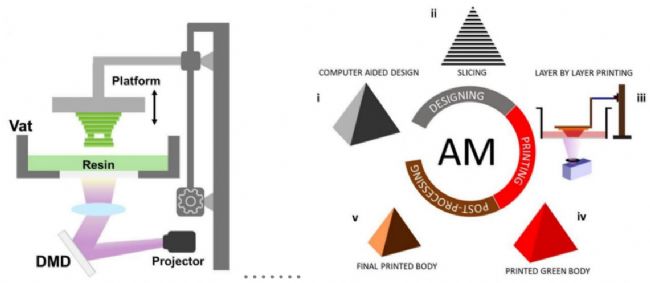 DLP打印設(shè)備結(jié)構(gòu)(左)及工藝的分步流程(右)示意圖