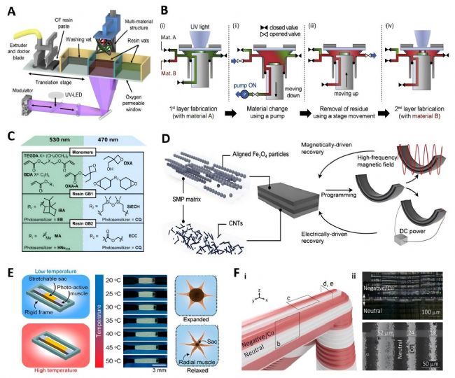 功能材料的集成對(duì)于推進(jìn)DLP技術(shù)并擴(kuò)大其在各個(gè)行業(yè)的應(yīng)用至關(guān)重要。當(dāng)與3D打印實(shí)現(xiàn)的獨(dú)特架構(gòu)相結(jié)合時(shí),具有多種刺激響應(yīng)能力的