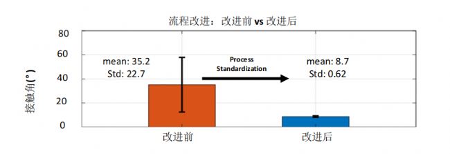 改進(jìn)前接觸角均值 35.2°,標(biāo)準(zhǔn)差高達(dá) 22.7;改進(jìn)后均值 8.7°,標(biāo)準(zhǔn)差僅 0.62,數(shù)據(jù)一致性大幅提升,證明設(shè)備運(yùn)行始終穩(wěn)定。