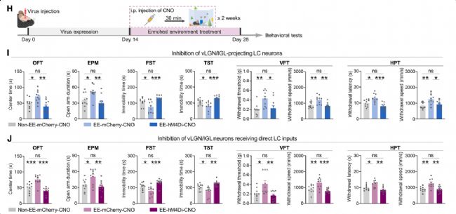 圖3、豐富環(huán)境刺激通過LC→vLGN/IGL環(huán)路發(fā)揮促應(yīng)激應(yīng)對(duì)行為作用