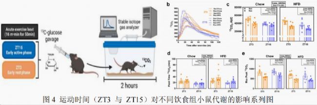 為了探討運(yùn)動(dòng)時(shí)間(晝夜節(jié)律)對(duì)運(yùn)動(dòng)后底物代謝的影響,以及肥胖如何改變這種“時(shí)間-代謝”可塑性,Karolinska與哥本哈根團(tuán)隊(duì)讓lean與HFD小鼠分別在靜息期(ZT3)或活動(dòng)期(ZT15)跑臺(tái)60min,隨后灌胃[U-¹³C