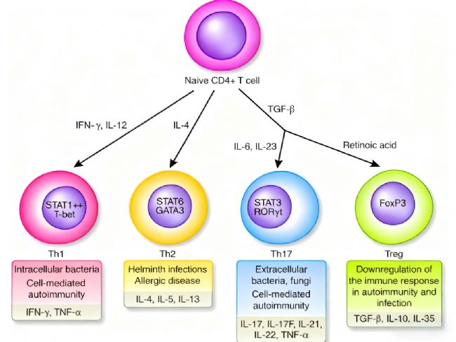 Th2和Th17細(xì)胞是CD4+T細(xì)胞的重要亞群,在免疫調(diào)節(jié)中發(fā)揮核心作用。Th2細(xì)胞主要分泌IL-4、IL-5、IL-13等細(xì)胞因子,參與過敏反應(yīng)和抗寄生蟲免疫;Th17細(xì)胞則主要產(chǎn)生IL-17、IL-22等,在防御胞外菌感染和自身免疫疾病中起關(guān)鍵作用。兩者的平衡失調(diào)與多種疾病狀態(tài)密切相關(guān):Th2過度活化見于過敏性哮喘、特應(yīng)性皮炎等;Th17異常增殖則與銀屑病、類風(fēng)濕關(guān)節(jié)炎等自身免疫疾病相關(guān)。