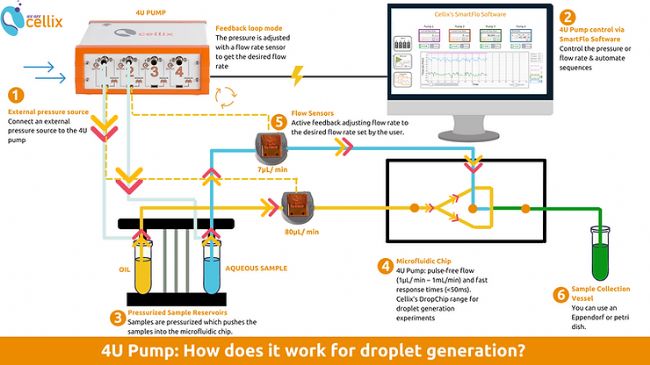 - 2 個微流體泵(或一個泵上的 2 個通道)——用于控制連續(xù)(油)相和分散(水)相的流動。根據(jù)應用,我們推薦使用 4U 壓力泵或 2 個 ExiGo 微流體注射泵。4U 壓力泵具有穩(wěn)定而準確的流速,可獨立控制 4 個不同的通道,控制壓力和流量。您可以使用智能手機編程流量曲線并有效管理所有泵功能。