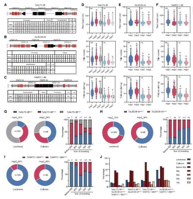 為評(píng)估TaNLP3-TaLBD38-TaNRT2.1調(diào)控模塊的育種潛力,團(tuán)隊(duì)對(duì)405份小麥種質(zhì)資源(359個(gè)栽培種、46個(gè)地方品種)進(jìn)行單倍型分析,鑒定出3個(gè)關(guān)鍵基因的優(yōu)異單倍型:TaNLP3-3BHap2、TaLBD38-4AHap2 和 TaNRT2.1-6B4Hap1。這些優(yōu)異單倍型在現(xiàn)代栽培種中的頻率呈下降趨勢(shì)(部分從70%降至30%),這為通過分子標(biāo)記輔助育種、回補(bǔ)優(yōu)異單倍型提供了重要靶點(diǎn)——將這些單倍型聚合到同一品種中,有望培育出“低氮高產(chǎn)、高氮高效”的小麥新品種。
