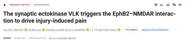 2025年11月20日,美國學(xué)者在Science期刊上發(fā)表了題名為“The synaptic ectokinase VLK triggers the EphB2–NMDAR interaction to drive injury-induced pain”的研究論文,研究揭示了細胞外磷酸化在調(diào)控突觸信號傳導(dǎo)與疼痛行為中的新機制。