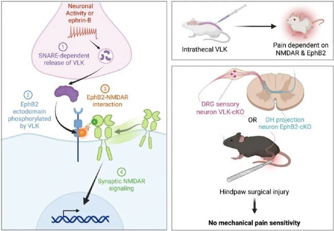 研究發(fā)現(xiàn)分泌型胞外激酶VLK能特異性磷酸化EphB2受體酪氨酸Y504位點,從而誘導(dǎo)EphB2與NMDA受體結(jié)合。VLK定位于突觸小泡,在神經(jīng)元活動增強時通過SNARE依賴方式釋放至突觸間隙。在疼痛模型中,感覺神經(jīng)元釋放的VLK通過激活脊髓背角投射神經(jīng)元中的EphB2-NMDAR信號通路,介導(dǎo)機械性痛覺超敏的形成。實驗證實,特異性敲除感覺神經(jīng)元中的VLK或投射神經(jīng)元中的EphB2均能阻斷損傷性疼痛行為,而鞘內(nèi)注射重組VLK則足以誘發(fā)疼痛樣行為。