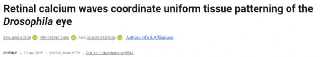 2025年11月20日,美國學(xué)者在Science期刊上發(fā)表了題名為“Retinal calcium waves coordinate uniform tissue patterning of the Drosophila eye”的研究論文,研究揭示了果蠅復(fù)眼發(fā)育過程中非神經(jīng)元鈣波調(diào)控組織有序化的新機制。