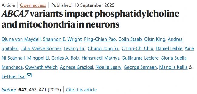 2025年9月10日,美國以及意大利學(xué)者聯(lián)合在Nature期刊上發(fā)表了題名為“ABCA7 variants impact phosphatidylcholine and mitochondria in neurons”的研究論文,揭示了ABCA7功能缺失變異通過破壞磷脂酰膽堿代謝介導(dǎo)阿爾茨海默病風(fēng)險的機制。