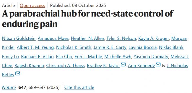 2025年10月8日,美國學(xué)者在Nature期刊上發(fā)表了題名為“A parabrachial hub for need-state control of enduring pain”的研究論文,揭示了臂旁核中表達Y1神經(jīng)肽受體的神經(jīng)元群體在持續(xù)性疼痛調(diào)控中的核心作用。