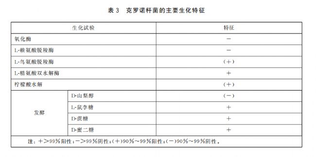 3、選取TSA平板上純化后的菌落進行生化鑒定,優(yōu)先選取克羅諾桿菌顯色培養(yǎng)基上最具典型特征菌落對應的純化菌落。用無菌接種環(huán)挑取新鮮傳代的純化菌落,按照微生物生化鑒定試劑盒說明書及關鍵生化指標檢測要求,依次進行氧化酶試驗、脫羧酶試驗、糖類發(fā)酵試驗及西蒙氏檸檬酸鹽試驗等。若首個典型菌落生化鑒定為陽性,則可判定該樣品檢出克羅諾桿菌,無需進一步鑒定其他菌落;若首個菌落為陰性,則依次選取其他純化菌落進行鑒定,直至所有挑取菌落均為陰性(判定未檢出)或出現(xiàn)陽性菌落(判定檢出)。對于需精準溯源的場景,可選取陽性菌落進行PCR靶向ITS區(qū)域檢測,進一步確認菌株身份?肆_諾桿菌的主要生化特征見表3。