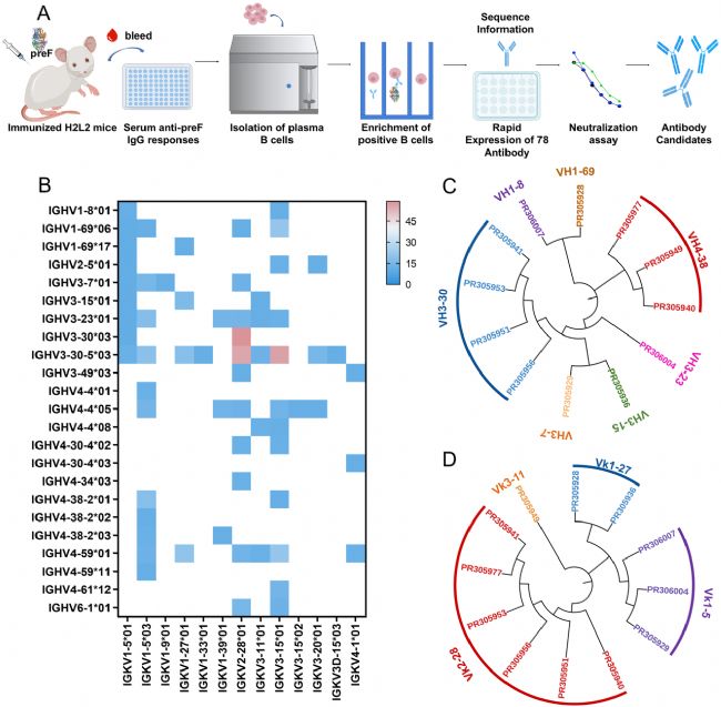 研究者以RSV pre-F蛋白為免疫原免疫H2L2全人源轉(zhuǎn)基因小鼠,再利用Beacon®單細(xì)胞光導(dǎo)系統(tǒng)從384個RSV F蛋白特異性單B細(xì)胞中回收獲得331對天然配對的抗體VH-VL序列;谛蛄卸鄻有院椭泻突钚院Y選,最終鑒定出12個強效中和抗體(NT50>1.6 log),其重鏈和輕鏈分別源自VH1/3/4和Vk1/2/3三大種系譜系,顯示出與人抗體庫高度相似的基因使用偏好。