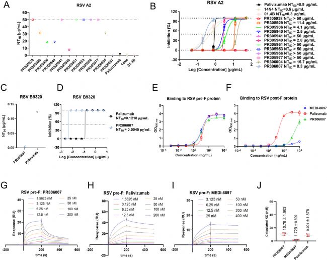 圖2. 6株單抗顯示出抗病毒活性,且單抗PR306007的效果優(yōu)于陽性對照帕利珠單抗和14N4(A, B)。PR306007對RSV-B亞型顯示出中和活性(C, D)。ELISA和SPR實驗顯示PR306007偏好結(jié)合RSV pre-F(E-J)。