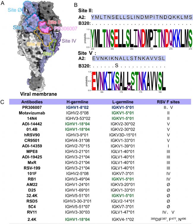 通過冷凍電鏡結(jié)構(gòu)解析,揭示其結(jié)合表位橫跨抗原位點II和V,結(jié)合模式新穎 。PR306007的表位在RSV A/B亞型中高度保守,S173L突變不影響氫鍵形成,即潛在抗逃逸能力強。其重鏈基因源自IGHV1–8,在已知抗病毒抗體譜系中較為罕見。