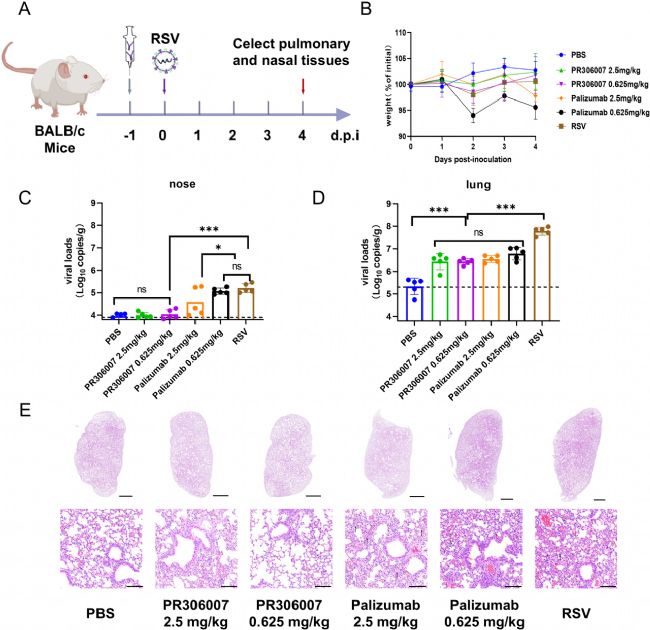 圖5. PR306007在RSV感染小鼠模型中的預(yù)防效果評估,包括實驗設(shè)計、體重監(jiān)測、鼻腔和肺部病毒載量檢測以及肺組織病理學(xué)分析。