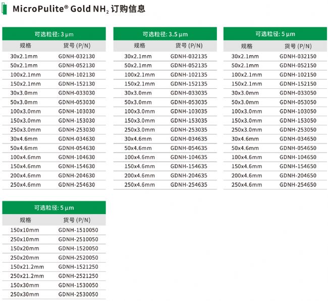 氨丙基鍵合硅膠色譜柱,能在親反相和正相體系下使用,三鍵鍵合技術(shù),色譜柱鍵合相流失降低。Gold NH
