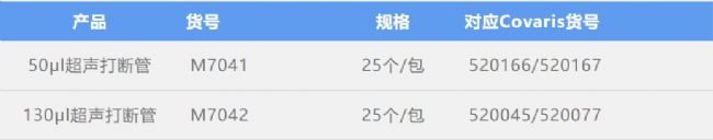 麥伯50μl超聲打斷管/ 130μL超聲打斷管,是Covaris系列超聲波剪切儀適配樣品管。利用聲波自動(dòng)聚焦AFA技術(shù),機(jī)械剪切DNA/RNA,所得片段DNA無(wú)熱損傷無(wú)偏好,片段化范圍150bp-1.5kb,具有高度的可重復(fù)性,適用于測(cè)序建庫(kù)等核酸片段化過程。