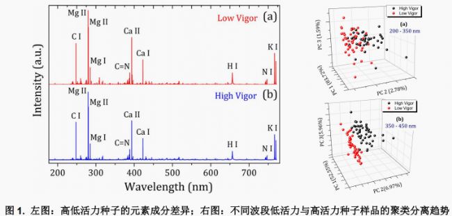 巴西作為全球最大的大豆出口國,其研究團(tuán)隊(duì)與意大利團(tuán)隊(duì)攜手,運(yùn)用激光誘導(dǎo)擊穿光譜(LIBS)技術(shù),結(jié)合多元分析與機(jī)器學(xué)習(xí)算法,探索快速高效區(qū)分低活力與高活力大豆種子批次的可行性。研究發(fā)現(xiàn),兩類種子的主要元素(C、Mg、Ca、N、K)發(fā)射峰強(qiáng)度存在差異,其中高活力種子的Ca I、C、C=N、Mg I/II等峰強(qiáng)度低于低活力種子。結(jié)果表明,LIBS技術(shù)結(jié)合主成分分析(PCA)及支持向量機(jī)(SVM)等機(jī)器學(xué)習(xí)算法,能夠高效區(qū)分低活力與高活力大豆種子批次——350-450 nm光譜波段為最佳鑒別區(qū)域,鈣元素是核心區(qū)分因子;SVM算法的分類準(zhǔn)確率最高可達(dá)98.9%,其中二次SVM和三次SVM分別在高活力、低活力種子識(shí)別中實(shí)現(xiàn)100%準(zhǔn)確率。