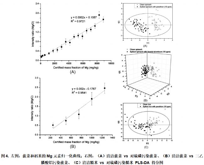 美韓科研團(tuán)隊(duì)運(yùn)用LIBS技術(shù),對(duì)菠菜和大米中的關(guān)鍵營養(yǎng)元素(Mg、Ca、Na、K)開展快速定量分析;同時(shí)結(jié)合化學(xué)計(jì)量學(xué)方法,實(shí)現(xiàn)了農(nóng)藥污染與未污染農(nóng)產(chǎn)品(菠菜、大米)的快速區(qū)分,有效解決了傳統(tǒng)方法難以鑒別農(nóng)藥污染的問題。盡管農(nóng)藥所含元素與農(nóng)產(chǎn)品自身元素存在重疊,無法通過單一元素檢測(cè)鑒別污染,但PLS-DA方法可借助LIBS光譜的多元素發(fā)射線分布特征,高效區(qū)分污染與未污染樣品。其中,清潔菠菜的誤分類率為0%,10 ppm農(nóng)藥污染菠菜的誤分類率僅為2%,且該方法對(duì)硫磷、三乙膦酸鋁污染均適用,充分驗(yàn)證了此項(xiàng)技術(shù)的實(shí)用性。