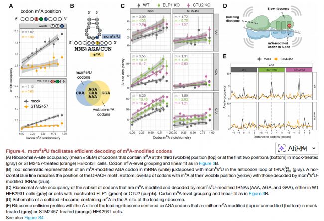 圖 4E:AGA 密碼子的核糖體碰撞圖譜,m⁶A 修飾組(上圖)碰撞信號顯著強(qiáng)于未修飾組(下圖),ELP1 KO/CTU2 KO 細(xì)胞中碰撞信號進(jìn)一步增強(qiáng),STM2457 處理后減弱。