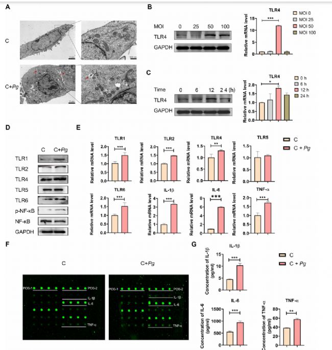(A)透射電子顯微鏡圖像顯示,牙齦卟啉單胞菌與牙齦上皮細(xì)胞共培養(yǎng) 2 小時(shí)后被細(xì)胞內(nèi)化的情況。(B)采用 qPCR(定量聚合酶鏈反應(yīng))和 Western blot(蛋白質(zhì)印跡法),分析不同感染復(fù)數(shù)(MOI)的牙齦卟啉單胞菌刺激牙齦上皮細(xì)胞 12 小時(shí)后,TLR4 的表達(dá)水平。(C)采用 qPCR 和 Western blot,分析感染復(fù)數(shù)(MOI)為 50 的牙齦卟啉單胞菌在不同時(shí)間點(diǎn)刺激牙齦上皮細(xì)胞后,TLR4 的表達(dá)水平。(D)Western blot 分析上皮細(xì)胞中 TLR1、TLR2、TLR4、TLR5、TLR6、NF-κB(核因子 κB)及磷酸化 NF-κB(p-NF-κB)的蛋白表達(dá)水平。各組縮寫(xiě)如下:對(duì)照組(C 組)、牙齦卟啉單胞菌刺激組(C+Pg 組)。(E)qPCR 分析 TLR1、TLR2、TLR4、TLR5、TLR6、白細(xì)胞介素 - 1β(IL-1β)、白細(xì)胞介素 - 6(IL-6)及腫瘤壞死因子 -α(TNF-α)的信使核糖核酸(mRNA)水平。(F)代表性細(xì)胞因子芯片膜圖像顯示 IL-1β、IL-6 及 TNF-α 的分泌表達(dá)情況。其中,POS-1 和 POS-2 為陽(yáng)性對(duì)照孔。(G)通過(guò)熒光強(qiáng)度對(duì)細(xì)胞因子芯片結(jié)果進(jìn)行定量分析。統(tǒng)計(jì)學(xué)差異以平均值 ± 標(biāo)準(zhǔn)差(mean±SD)表示,* 代表 P<0.05,** 代表 P<0.005,*** 代表 P<0.001。