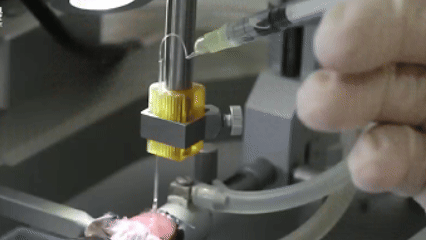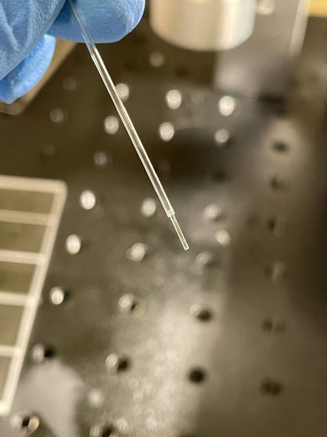 - 等待牙科水泥固化后,使用制備好的槍尖向毛細(xì)玻璃管內(nèi)注射解膠劑(如丙酮),溶解 GRIN Lens 和毛細(xì)管之間的502膠水后,可以升高夾持器,將毛細(xì)玻璃管與 GRIN Lens 分離。