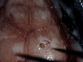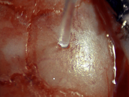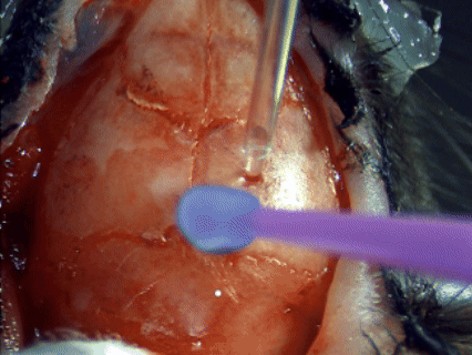 - 將顱骨鉆速度調(diào)至低檔,持顱骨鉆輕輕打磨,使用洗耳球輕輕吹去碎屑,重復(fù)此操作直至打磨至硬腦膜。
