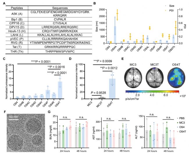 CPPs修飾對LNP性質(zhì)的影響:為了進(jìn)一步提高OS4 LNP的腦遞送效率,本研究通過點擊化學(xué)將10種不同的細(xì)胞穿透肽(CPPs)修飾到OS4 LNP表面。實驗結(jié)果顯示,A5K、THR和LAH4肽修飾導(dǎo)致OS4 LNP發(fā)生聚集,粒徑超過450納米(圖3B),因此排除了這些肽的進(jìn)一步研究。