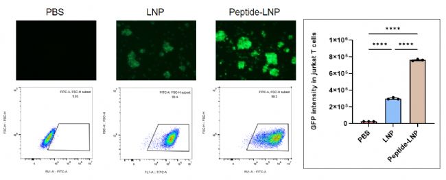 Peptide-LNP顯著提升目標(biāo)細(xì)胞轉(zhuǎn)染效率,同種LNP連接Peptide后在T細(xì)胞中表達(dá)水平提升接近3倍。