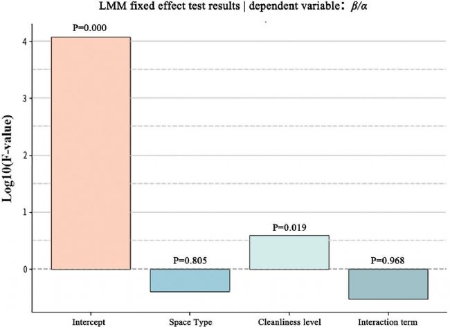 圖2. 線性混合模型(LMM)固定效應(yīng)檢驗(yàn)結(jié)果 自變量:β/α 比值. Intercept:截距項(xiàng);Space Type: 空間類型;Cleanliness: 整潔度;Interaction term: 交互項(xiàng)(Space Type × Cleanliness)