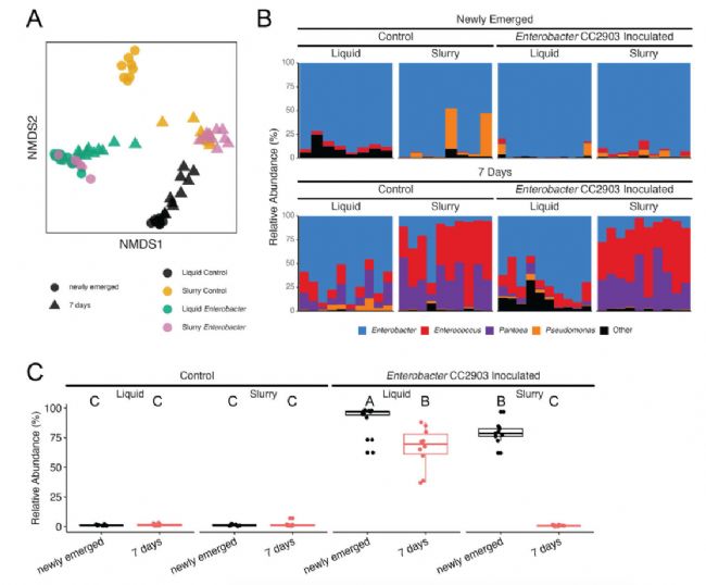 昆蟲腸道微生物菌群在宿主健康和與環(huán)境的相互作用中發(fā)揮著重要作用。在實驗室和大規(guī)模飼養(yǎng)的昆蟲中,腸道微生物菌群的組成和功能與野生型相比可能有所不同,而了解影響細菌在宿主中定植能力的因素對于在大規(guī)模飼養(yǎng)的昆蟲中植入曾丟失的或新的微生物菌群至關(guān)重要。在近期發(fā)表的一項關(guān)于評估飼料配方與宿主年齡對實驗室及大規(guī)模飼養(yǎng)的地中海果蠅腸道中目標細菌定植影響的研究中3,Charles J. Mason等使用不同飼料配方(液體與漿狀)對新生與7日齡果蠅進行腸桿菌菌株接種,菌株帶有抗生素抗性標記以便于追蹤,并采用PacBio Kinnex 全長16S rRNA測序進行高分辨率分析。研究結(jié)果顯示,液體飼料能高效促進目標菌株在果蠅腸道內(nèi)定植,且效果不受果蠅年齡或品系來源的影響,而漿狀飼料的接種在年齡較大的果蠅中效果較差。通過全長16S測序,研究不僅成功追蹤到目標腸桿菌菌株的特定序列,還揭示了在屬級分類之下潛藏的菌株水平多樣性。與傳統(tǒng)的短片段測序相比,全長16S測序展現(xiàn)了更卓越的分辨能力,能夠清晰區(qū)分不同的腸桿菌擴增子序列變異(ASV),而這些信號在僅使用V4或V3-V4區(qū)域測序時被降低。研究揭示了利用液體飼料進行微生物干預的潛力,同時表明了PacBio全長16S rRNA測序技術(shù)在解析昆蟲微生物菌群復雜性和追蹤特定菌株方面具有顯著優(yōu)勢,為通過微生物菌群管理提升害蟲防治效果提供了新的技術(shù)路徑。