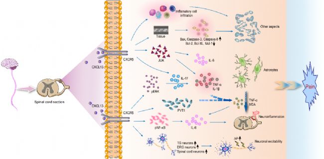 神經(jīng)膠質(zhì)細胞(星形膠質(zhì)細胞和小膠質(zhì)細胞)的激活是中樞敏化的重要基礎。CXCL13/CXCR5通路可直接激活星形膠質(zhì)細胞:在脊髓損傷模型中,鞘內(nèi)注射CXCL13可顯著增加星形膠質(zhì)細胞標志物GFAP的表達,而下調(diào)CXCL13則能減少星形膠質(zhì)細胞激活,改善神經(jīng)功能并減輕痛覺過敏。此外,該通路還可通過星形膠質(zhì)細胞-小膠質(zhì)細胞相互作用間接激活小膠質(zhì)細胞,促進ATP、CCL2等信號分子的釋放,進一步放大疼痛信號。研究發(fā)現(xiàn),CXCR5缺陷小鼠在神經(jīng)損傷后小膠質(zhì)細胞激活明顯減少,證實膠質(zhì)細胞活化依賴于CXCL13/CXCR5通路的調(diào)控。