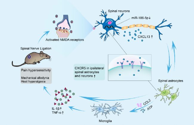 圖 5:脊髓神經(jīng)結扎后脊髓神經(jīng)元 - 神經(jīng)膠質(zhì)細胞相互作用通過 CXCL13/CXCR5 通路導致神經(jīng)病理性疼痛