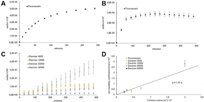 圖2 (A)每30分鐘至8小時(shí)超時(shí)定量熒光素滲透性(mol/m−3x103) (B)每10分鐘至4小時(shí)超時(shí)定量熒光素滲透性(mol/m−3x103) (C) 4000、10000、20000和40000 g/mol分子量 (mol/m−3x103)的異硫氰酸酯-葡聚糖(右旋糖酐)的熒光素滲透性,每30分鐘進(jìn)行一次定量,直至8小時(shí)。(D)根據(jù)量化滲透率計(jì)算出的滲透系數(shù)(m/sec)x10−8與所研究的異硫氰酸熒光素-葡聚糖所描述的斯托克斯半徑的倒數(shù)((m−1)x109))之間的加權(quán)最小二乘擬合。