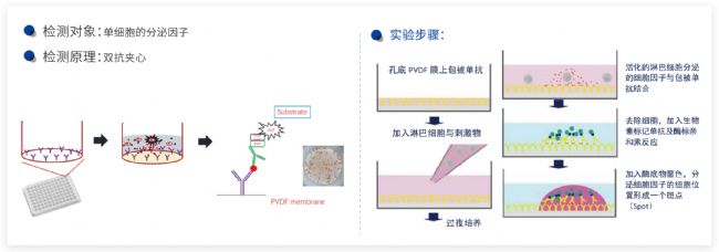 酶聯(lián)免疫斑點技術(shù)(Enzyme Linked Immunospot Assay, ELISPOT)是一種基于經(jīng)典夾心法免疫分析原理的高靈敏度檢測技術(shù)。其技術(shù)核心在于利用預(yù)先包被于聚偏二氟乙烯(PVDF)膜上的特異性捕獲抗體,對受抗原刺激的單個細胞所分泌的細胞因子或抗體進行原位捕獲。通過后續(xù)的檢測抗體、酶聯(lián)親和素及顯色底物反應(yīng),在細胞原位形成不溶性斑點,每個斑點對應(yīng)一個功能性分泌細胞,從而實現(xiàn)對特異性免疫應(yīng)答的單細胞水平檢測與分析。