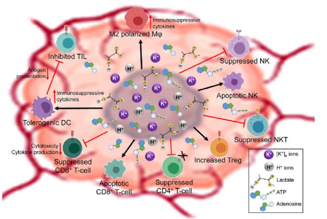 此外,腫瘤微環(huán)境通過(guò)多種理化及生物因素進(jìn)一步削弱T細(xì)胞功能。腫瘤內(nèi)部常出現(xiàn)離子濃度紊亂(如細(xì)胞外鉀離子水平升高)、缺氧以及酸度增加等情況。死亡或壞死的腫瘤細(xì)胞釋放大量胞內(nèi)物質(zhì),包括鉀離子、ATP及腺苷等,加劇了微環(huán)境的異常。同時(shí),因營(yíng)養(yǎng)匱乏、缺氧及代謝重編程導(dǎo)致的乳酸堆積,進(jìn)一步降低了細(xì)胞外pH值。這種酸性、高鉀且缺氧的微環(huán)境不僅直接抑制腫瘤浸潤(rùn)淋巴細(xì)胞(TIL)的活化與效應(yīng)功能,誘導(dǎo)其功能失能狀態(tài),還促進(jìn)具有免疫抑制特性的調(diào)節(jié)性T細(xì)胞(Tregs)及耐受性樹(shù)突狀細(xì)胞(DCs)的分化與聚集。這些耐受性DCs抗原提呈能力受損,嚴(yán)重影響腫瘤抗原向T細(xì)胞的遞呈,從而阻礙抗腫瘤T細(xì)胞應(yīng)答的啟動(dòng)。整體而言,腫瘤微環(huán)境通過(guò)多重機(jī)制協(xié)同作用,破壞免疫平衡,促進(jìn)腫瘤的免疫逃逸、生長(zhǎng)與轉(zhuǎn)移。