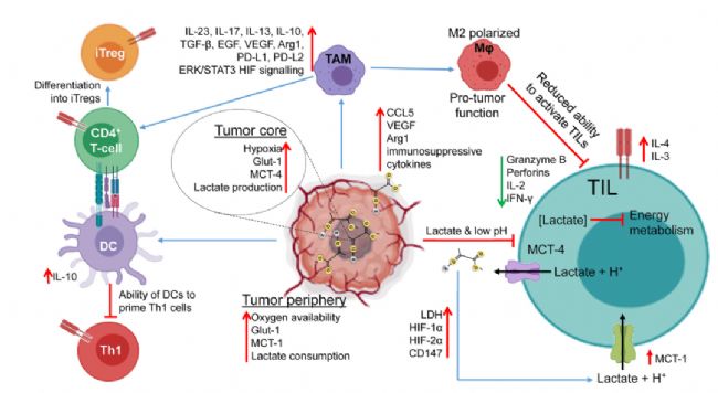 TME中的乳酸積累影響免疫途徑,導(dǎo)致T細(xì)胞抗腫瘤反應(yīng)受損。