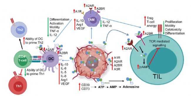 從機(jī)制上看,腫瘤微環(huán)境中可溶性及細(xì)胞膜結(jié)合的外核苷酸酶(如CD39和CD73)活性升高,顯著提升了局部腺苷水平。腺苷可誘導(dǎo)免疫抑制性細(xì)胞因子(如IL-10、IL-6、VEGF等)的產(chǎn)生,同時(shí)抑制腫瘤相關(guān)巨噬細(xì)胞與樹(shù)突狀細(xì)胞的功能。這些變化不僅促進(jìn)腫瘤進(jìn)展,也損害腫瘤浸潤(rùn)淋巴細(xì)胞的增殖能力、運(yùn)動(dòng)性及細(xì)胞毒性,從而全面抑制抗腫瘤免疫應(yīng)答。