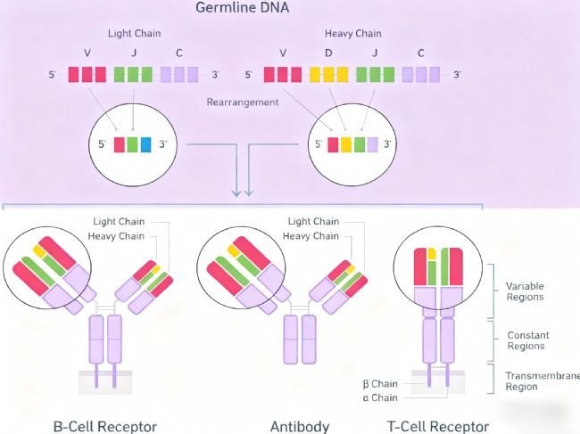 TCR 與 BCR 的基因編碼區(qū)均包含 V(可變區(qū))、D(多樣性區(qū))、J(連接區(qū))及 C(恒定區(qū))片段,其中 TCRα 鏈與 BCR 輕鏈的編碼序列不含 D 區(qū)。機(jī)體通過(guò) V (D) J 基因重組與重排機(jī)制,賦予 TCR/BCR 高度的多樣性,為識(shí)別各類抗原提供分子基礎(chǔ),從而保障特異性免疫應(yīng)答的廣譜性與高效性。