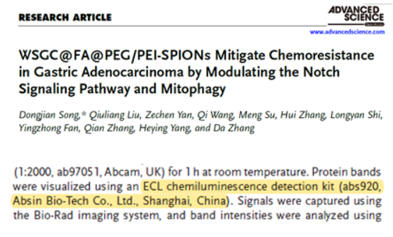 本研究創(chuàng)新性地將 WSGC 肽與 SPIONs 結(jié)合,構(gòu)建靶向納米遞藥系統(tǒng),通過抑制 Notch-線粒體自噬軸突破胃癌化療耐藥,為多肽類腫瘤療法提供新方向。其中,Absin 的 abs920 ECL 試劑盒憑借高靈敏度與穩(wěn)定性,在蛋白水平驗證機制中發(fā)揮關(guān)鍵作用,助力研究成果發(fā)表于《Advanced Science》。