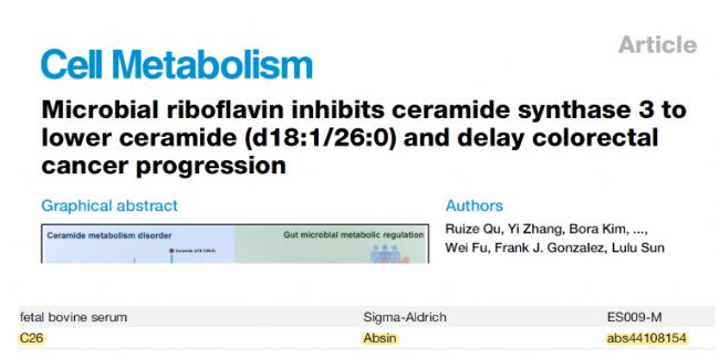 結(jié)直腸癌(CRC)是全球癌癥相關(guān)死亡的主要原因之一,約半數(shù)患者會發(fā)展為轉(zhuǎn)移性疾病,現(xiàn)有治療方案仍面臨部分患者響應(yīng)有限的困境。近期,《Cell Metabolism》發(fā)表了一項突破性研究,揭示了 “腸道微生物 - 神經(jīng)酰胺代謝 - CRC 進(jìn)展” 的全新調(diào)控機(jī)制,并提出了靶向治療新策略。其中,Absin 的 C26 神經(jīng)酰胺(貨號:abs44108154)作為核心實驗試劑,為驗證關(guān)鍵科學(xué)假設(shè)提供了穩(wěn)定、可靠的物質(zhì)基礎(chǔ),助力研究者解鎖 CRC 代謝調(diào)控的新密碼。