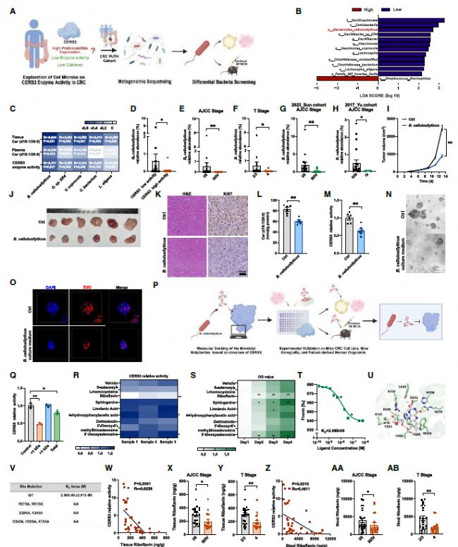 為何部分 CERS3 高表達(dá)患者的 C26 水平較低?宏基因組測序揭示:腸道菌解纖維素擬桿菌(B. cellulosilyticus)的豐度與 C26 水平、CERS3 活性呈負(fù)相關(guān),且該菌豐度在晚期 CRC 患者中顯著降低。進(jìn)一步驗證發(fā)現(xiàn),B. cellulosilyticus 通過分泌核黃素直接結(jié)合 CERS3 并抑制其活性,從而降低 C26 水平,延緩 CRC 進(jìn)展。