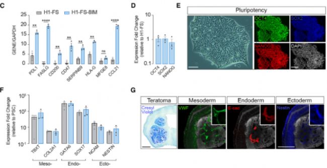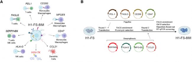本研究模擬胎盤和癌細(xì)胞的免疫逃逸機(jī)制,分兩輪用不同轉(zhuǎn)座子系統(tǒng)將 8 種免疫調(diào)節(jié)基因(PDL1、CD200、CD47、HLAG、FASLG、SERPINB9、CCL21、MFGE8)轉(zhuǎn)入 H1 人多能干細(xì)胞(hPSC):第一輪用 PiggyBac 轉(zhuǎn)座子插入 4 個(gè)基因并經(jīng)嘌呤霉素篩選;第二輪用 SleepingBeauty 轉(zhuǎn)座子插入剩余 4 個(gè)基因并帶熒光報(bào)告基因,構(gòu)建 H1FS8IM 細(xì)胞系,引入 HSVTK 自殺基因(與 CDK1 轉(zhuǎn)錄關(guān)聯(lián))。通過qPCR、免疫熒光實(shí)驗(yàn)等驗(yàn)證H1-FS-8IM 細(xì)胞經(jīng)基因編輯后其多能性、三胚層分化能力無顯著變化,是具備正常分化潛能的多能干細(xì)胞(圖1)。