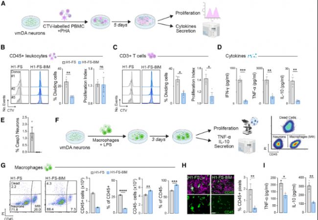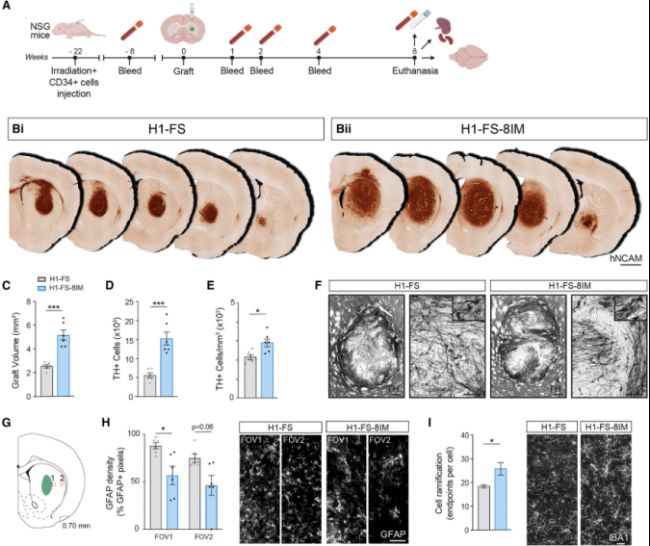 為了證明H1FS8IM能夠規(guī)避免疫檢測,研究人員首先構(gòu)建了NSG 小鼠,NSG小鼠是一種重度免疫缺陷小鼠,向NSG小鼠體內(nèi)移植人CD34+造血干細(xì)胞,可重建人的免疫系統(tǒng),再向該小鼠中注射H1FS8IM 或hPSC,構(gòu)建小鼠模型。通過免疫組織化學(xué)染色顯示:H1-FS-8IM 組(Bii)與H1-FS 組(Bi)相比,hNCAM 陽性區(qū)域(人源神經(jīng)細(xì)胞黏附分子,用于特異性標(biāo)記移植的人源神經(jīng)元)持續(xù)存在,證明免疫隱形改造使移植物在體內(nèi)長期存活;通過移植物核心定量指標(biāo)顯示(圖3C-E),H1-FS-8IM 組移植物體積顯著大于 H1-FS 組,證明其存活能力更強(qiáng),H1-FS-8IM 組移植物形態(tài)規(guī)則,神經(jīng)元分布均勻,證明其體內(nèi)微環(huán)境更穩(wěn)定的;TH⁺細(xì)胞數(shù)量顯著更多,說明其定向分化功能未受免疫改造影響;且H1-FS-8IM 組的 GFAP 密度顯著更低,說明其引發(fā)的炎癥反應(yīng)更弱(圖3H);H1-FS-8IM 組的神經(jīng)元軸突投射數(shù)量更多,證明其能更好地與宿主神經(jīng)環(huán)路實(shí)現(xiàn)功能性整合(圖3I)。核心結(jié)論:H1-FS-8IM 神經(jīng)移植物在體內(nèi)可長期存活、高效分化為多巴胺能神經(jīng)元,同時(shí)減少炎癥反應(yīng)并實(shí)現(xiàn)功能整合,驗(yàn)證了其作為細(xì)胞治療產(chǎn)品的體內(nèi)有效性。